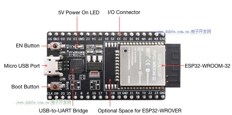下面是ESP32 WROOM DevKitC v4 開發板的布局: