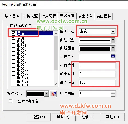 3、點擊曲線設置,分別勾選曲線1和曲線2,對應的曲線內容更改為剛才添加的組對象成員:溫度1和溫度2,并設置組對象成員的小數位顯示和上下限值顯示。注意的是上下限值以曲線1的設置為準;