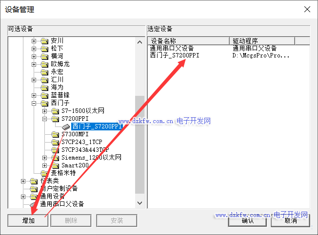 第四步:(把西門子_S7200PPI驅(qū)動(dòng)添加至右側(cè)選定設(shè)備通用串口父設(shè)備之下)