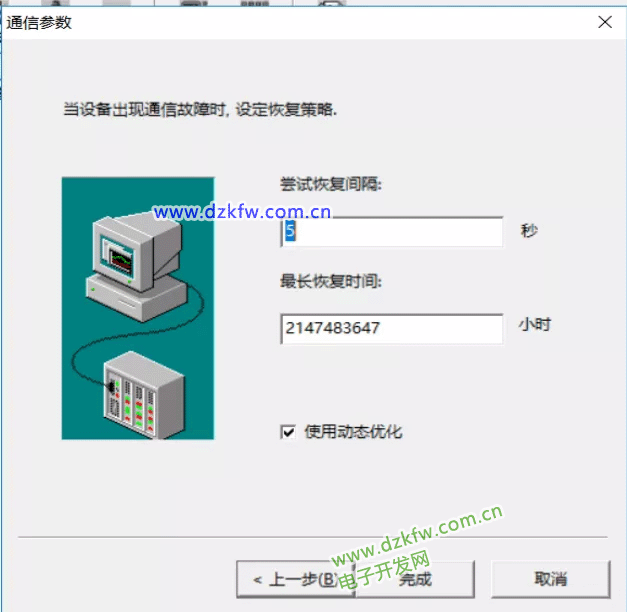 設置故障恢復策略,建議恢復間隔設置小一些,避免由于通訊中斷造成過多的數據丟失。最長恢復時間設置的要大一些,避免由于設備長時間停機,待開機后,通訊無法恢復。