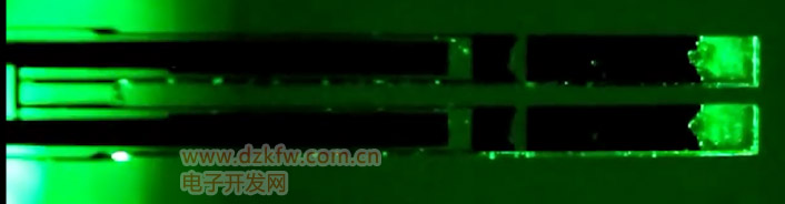 晶振中的石英晶體為一薄片,薄片兩端涂有導電的銀層,并連出兩個電極,如下圖1-1所示為電子手表中所用晶振的內部晶片。