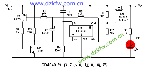 CD4040是12級串行分頻器,用Q12 輸出高電平來關閉電路輸出,實際上是Q11輸出變為低電平完成一個延時周期,分頻系數是2的11次方,也就是2048分頻。