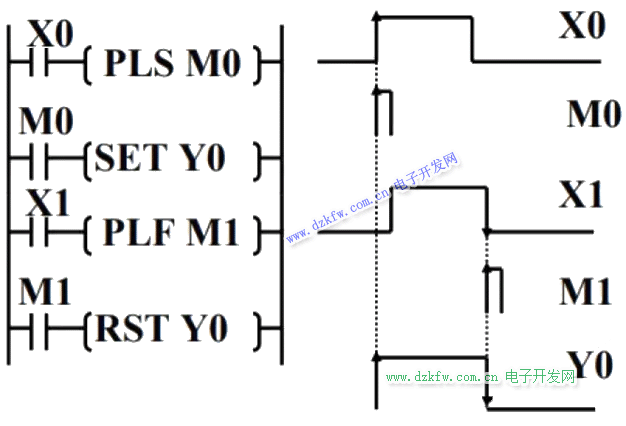 LDF、ANDF、ORF指令是進行下降沿檢出的觸點指令,僅在指定位元件的下降沿時(ON→OFF變化時)接通一個掃描周期。