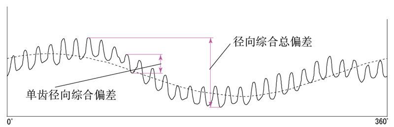 齒距累積總偏差(Fp)測定全輪齒齒距偏差做出評價。齒距累積偏差曲線的總振幅值為齒距總偏差。