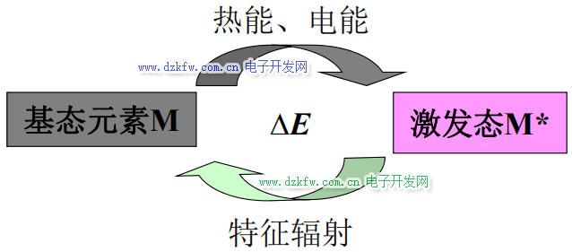 在正常狀態下,元素處于基態,元素在受到熱(火焰)或電(電火花)激發時,由基態躍遷到激發態,返回到基態時,發射出特征光譜(線狀光譜) 。
