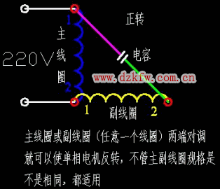 它有兩個繞組,一般主繞組線徑較大一點,還有一個啟動繞組(副繞組),啟動繞組串聯一個電容器,是它的電壓遲后電流90度,這樣兩組繞組得到不同的磁場,形成了旋轉磁場,電動機就轉起來了。