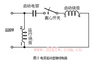 第二種,電機靜止時離心開關是接通的,給電后起動電容參與起動工作,當轉子轉速達到額定值的70%至80%時離心開關便會自動跳開,起動電容完成任務,并被斷開。起動繞組不參與運行工作,而電動機以運行繞組線圈繼續動作,如圖2。