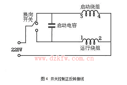 圖4是帶正反轉開關的接線圖,通常這種電機的起動繞組與運行繞組的電阻值是一樣的,就是說電機的起動繞組與運行繞組是線徑與線圈數完全一致的。一般洗衣機用得到這種電機。這種正反轉控制方法簡單,不用復雜的轉換開關。