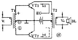 圖 6 是常用的乙類推挽功率放大電路。它由兩個特性相同的晶體管組成對稱電路,在沒有輸入信號時,每個管子都處于截止?fàn)顟B(tài),靜態(tài)電流幾乎是零,只有在有信號輸入時管子才導(dǎo)通,這種狀態(tài)稱為乙類工作狀態(tài)。當(dāng)輸入信號是正弦波時,正半周時 VT1 導(dǎo)通 VT2 截止,負(fù)半周時 VT2 導(dǎo)通 VT1 截止。兩個管子交替出現(xiàn)的電流在輸出變壓器中合成,使負(fù)載上得到純正的正弦波。這種兩管交替工作的形式叫做推挽電路。