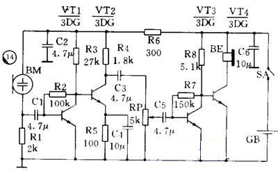 圖 14 是一個助聽器電路,實(shí)際上是一個 4 級低頻放大器。 VT1 、 VT2 之間和 VT3 、 VT4 之間采用直接耦合方式, VT2 和 VT3 之間則用 RC 耦合。為了改善音質(zhì), VT1 和 VT3 的本級有并聯(lián)電壓負(fù)反饋( R2 和 R7 )。由于使用高阻抗的耳機(jī),所以可以把耳機(jī)直接接在 VT4 的集電極回路內(nèi)。 R6 、 C2 是去耦電路, C6 是電源濾波電容。
