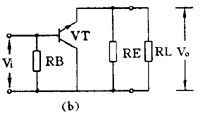 圖 3 ( a )是一個射極輸出器。它的輸出電壓是從射極輸出的。圖 3 ( b )是它的交流通路圖,可以看到它是共集電極放大電路。