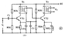 圖 15 是普及型收音機(jī)的低放電路。電路共 3 級,第 1 級( VT1 )前置電壓放大,第 2 級( VT2 )是推動級,第 3 級( VT3 、 VT4 )是推挽功放。 VT1 和 VT2 之間采用直接耦合, VT2 和 VT3 、 VT4 之間用輸入變壓器( T1 )耦合并完成倒相,最后用輸出變壓器( T2 )輸出,使用低阻揚(yáng)聲器。此外, VT1 本級有并聯(lián)電壓負(fù)反饋( R1 ), T2 次級經(jīng) R3 送回到 VT2 有串聯(lián)電壓負(fù)反饋。電路中 C2 的作用是增強(qiáng)高音區(qū)的負(fù)反饋,減弱高音以增強(qiáng)低音。 R4 、 C4 為去耦電路, C3 為電源的濾波電容。整個電路簡單明了。