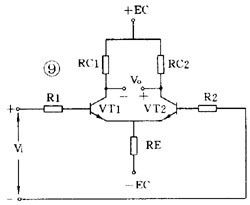 解決零點(diǎn)漂移的辦法是采用差分放大器,圖 9 是應(yīng)用較廣的射極耦合差分放大器。它使用雙電源,其中 VT1 和 VT2 的特性相同,兩組電阻數(shù)值也相同, R E 有負(fù)反饋?zhàn)饔谩?shí)際上這是一個橋形電路,兩個 R C 和兩個管子是四個橋臂,輸出電壓 V 0 從電橋的對角線上取出。沒有輸入信號時,因?yàn)?RC1=RC2 和兩管特性相同,所以電橋是平衡的,輸出是零。由于是接成橋形,零點(diǎn)漂移也很小。