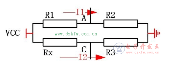 假設流過R1,R2橋臂的電流為I1,流過R3,Rx橋臂的電流為I2,電橋供電電壓為VCC,如下圖所示。