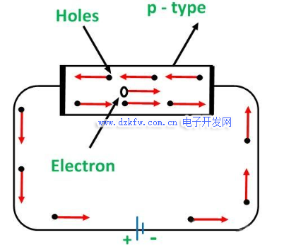 在P型半導體中,大量的空穴是由三價雜質產生的。當在這種類型的半導體上施加電位差時,如下圖所示: