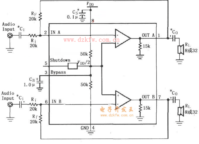 如圖所示為LM4880/4881用于雙聲道放大器的典型電路。左右聲道音頻信號分別輸入LM4880(SOP/MSOP封裝)的2、6腳,經過內部放大器放大后分別由1、7腳輸出,經耦合電容Co加到各自聲道的揚聲器上。放大器增益由電阻Ri和RF決定,即Av=-RF/Ri。放大器的最大功耗為PDMAX=VDD2/2π2RL。輸入端輸出端外接電阻和電容分別決定輸入和輸出-3dB帶寬:Ci≥l/2π×20kΩ×20Hz,采用0.39μF(約);Co≥1/(2π×8Ω×20Hz),采用約1000μF。LM4880的5腳外接關斷控制,當5腳接VDD(高電平)時禁止工作;當5腳接地(低電平)時允許工作。