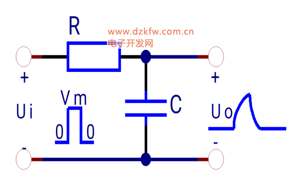 設(shè)輸入信號UI為矩形脈沖波,當(dāng)UI由0跳邊到Vm時,相當(dāng)于電路的輸入端接了一個電源電壓Vm,電容C開始充電,Uc以指數(shù)規(guī)律上升。 由于Τrc>tp,所以電容C的充電過程緩慢,在t1-t2時刻內(nèi),Uc的上升只是指數(shù)函數(shù)曲線很小的一段。