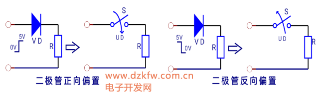 當(dāng)外加正向電壓(硅管>0.7V,鍺管>0.3V)時,二極管導(dǎo)通,相當(dāng)于閉合開關(guān)串接管壓降UD(硅管0.7V,鍺管0.3V)。 如果外加電壓遠(yuǎn)大于UD,則可忽略UD的影響,電阻兩端電壓約等于輸入的電壓。