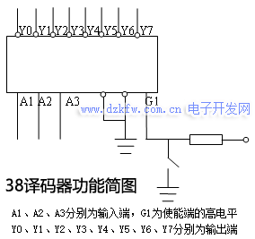 A1、A2、A3分別為輸入端,G1為使能端的高電平,Y0、Y1、Y2、Y3、Y4、Y5、Y6、Y7分別為輸出端。