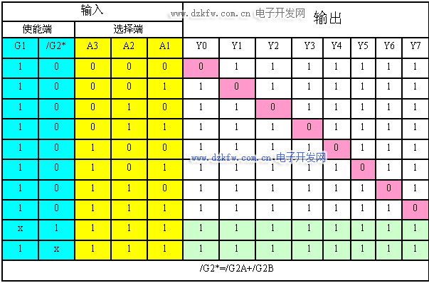 注:表中的藍(lán)色區(qū)域為輸入使能端,黃色區(qū)域為輸入選擇端,綠色區(qū)域表示該譯碼器不工作。