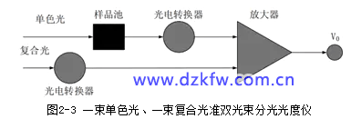 1) 單光束分光光度計(jì):只有一束單色光,一個(gè)樣品池,一個(gè)光電轉(zhuǎn)換器(通常采用硅光電池、光敏三極管或光電管),如圖2-1所示,其結(jié)構(gòu)簡單、價(jià)格便宜,但因其雜散光、光源波動、電子學(xué)的噪聲等都不能消除,故單光束分光光度計(jì)的光度準(zhǔn)確較差。